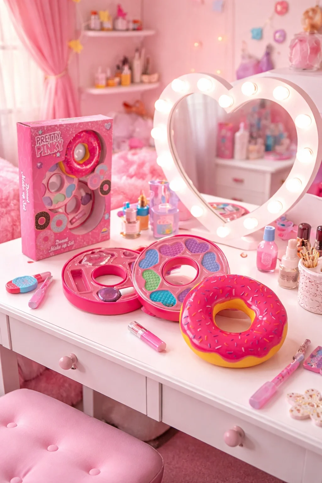 Ürün içerisinde 8 farklı renk göz farı, ruj, oje ve çeşitli aksesuarlar yer almaktadır. Çocuklar bu set ile oyun oynarken hayal güçlerini kullanabilir, kendi stillerini keşfedebilir ve eğlenceli rol yapma oyunları oluşturabilir. Donut şeklindeki tasarımı sayesinde ürün klasik makyaj setlerinden ayrılır ve çok daha dikkat çekici bir görünüm sunar.