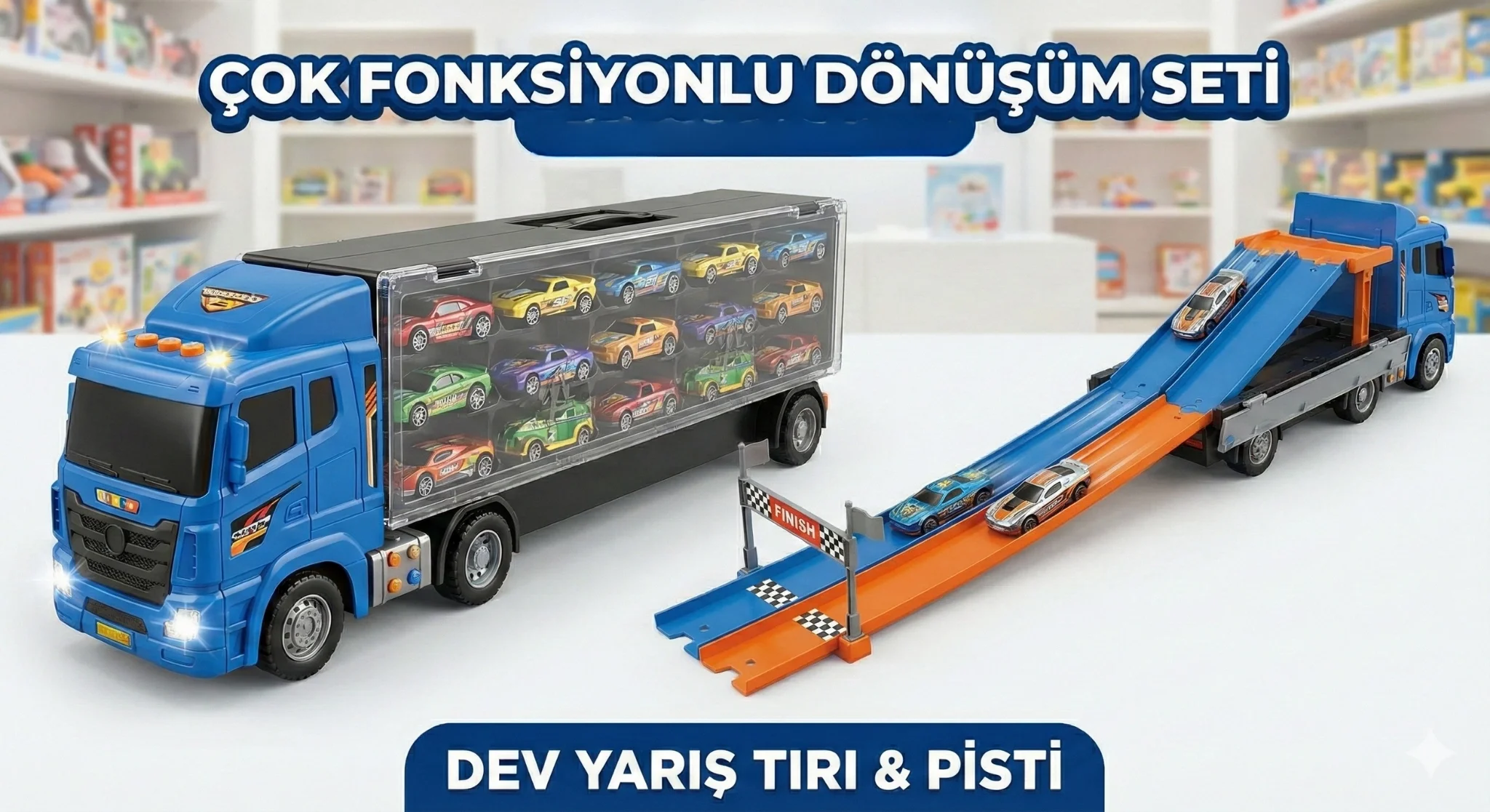 Bu ozel tasarim tır, saniyeler icinde devasa bir yaris pistine donusebilmektedir. Arka kapagi acilarak uzayan mekanizmasi sayesinde cocuklar, tasiyici tiri hizli bir sekilde cift seritli bir yaris parkuruna cevirebilir. Kurulum gerektirmeyen bu pratik yapi, oyun keyfini kesintisiz hale getirir.
