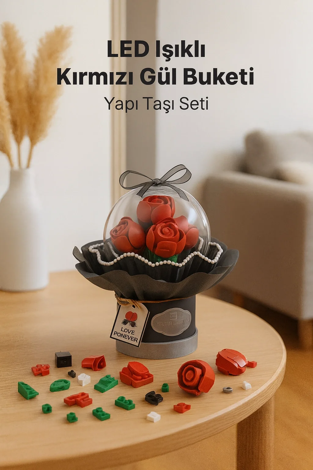Romantik bir gül buketinin zarafetini blok yapımının keyfiyle buluşturan bu set, sergilenebilir şık bir obje ve aynı zamanda yaratıcı bir hobi deneyimi sunar. Oturma odası, çalışma masası veya vitrin alanları için dekoratif bir dokunuş katarken, sevdiklerinize anlamlı bir hediye alternatifi oluşturur.