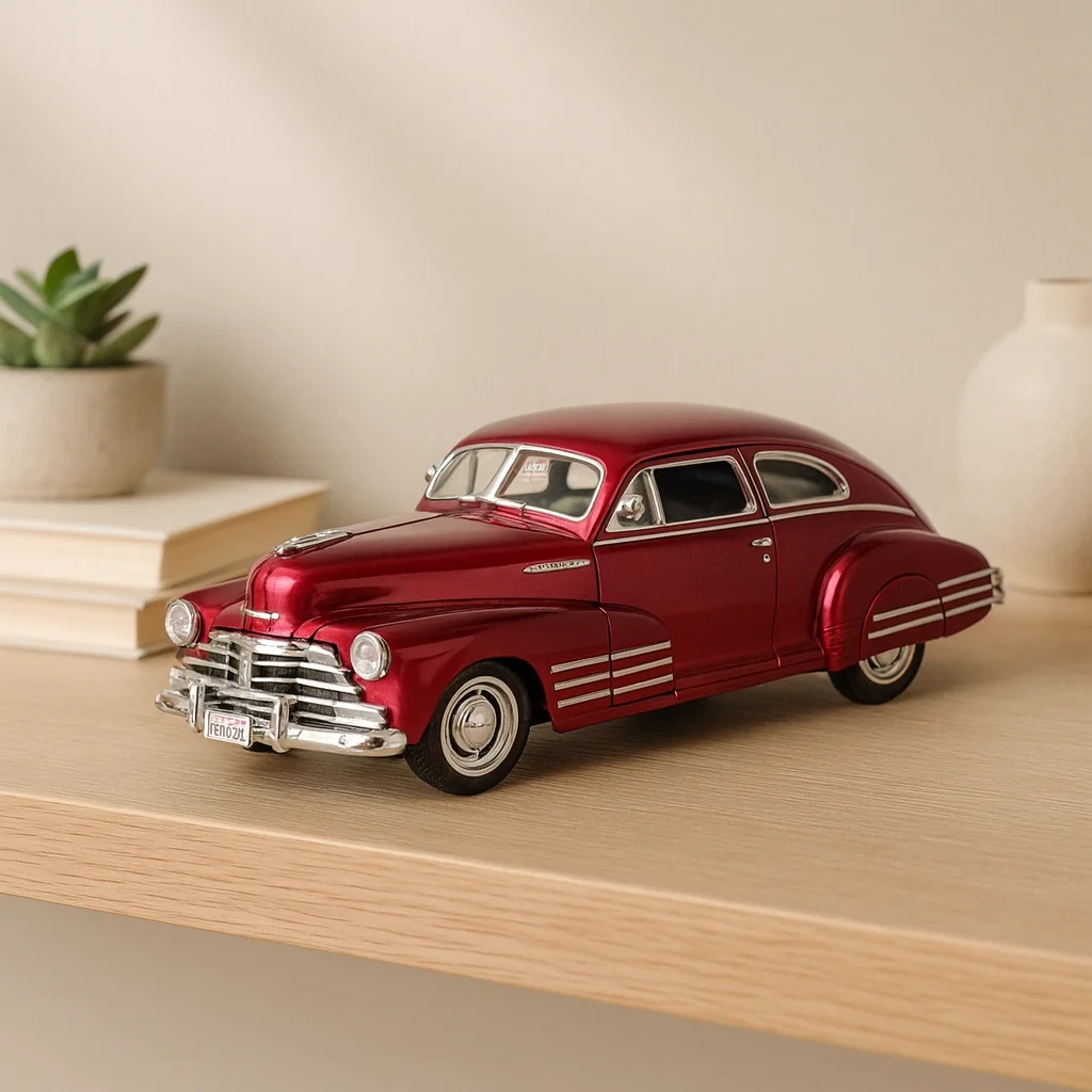Klasik otomobil tutkunları için özenle üretilmiş bu lisanslı 1:24 1948 Chevy Aerosedan Fleetline model, metalik kırmızı rengi ve krom efektli detaylarıyla dönemin zarafetini günümüze taşır. İskandinav tarzı ahşap raf konseptinde yapılan çekim; sade, modern ve sıcak bir atmosferde modelin hatlarını ön plana çıkarır. Koleksiyonunuza güçlü bir karakter eklemek ya da ofis/ev dekorasyonunda dikkat çeken bir parça kullanmak isteyenler için idealdir.